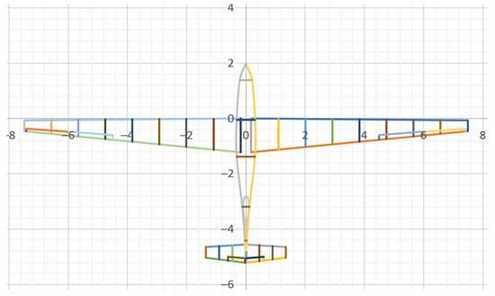 The next step is to match the geometrical parameters to the aerodynamic requirements. Each element—wing, vertical and horizontal stabiliser, etc.—is divided into segments. The segments are characterised by cross-sections and then linearly interpolated. The number of segments for the wing is equal to the number of ribs, which can be up to 20 segments. For each segment, all geometrical data are calculated, e.g., chord, angle of attack, and cross-section surface area. To obtain some geometry-related parameters, differential equations are solved using substitution, with accuracy up to 0.001 mm in the case of caisson radii. Then, the points that define the outline are positioned in space. For each section, aerodynamic properties and forces are calculated using the methodology described in [25]—the parameters are calculated analytically for each segment using the aerofoil database, requested flight parameters, and introduced geometry and then subsequently added. The spreadsheets automatically recalculate the parameters when the input changes.