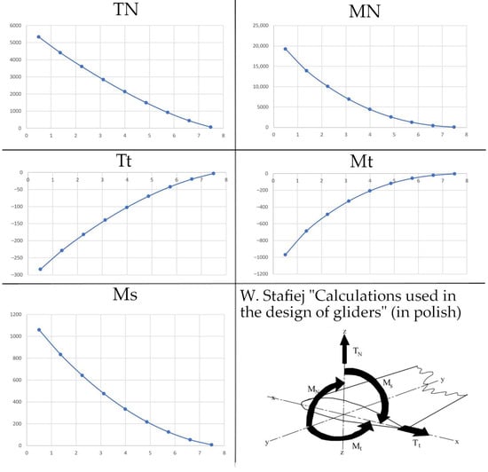 Aerodynamic parameters are checked using graphs and numerical data presented in the tables. The geometric and aerodynamic parameters are used to determine the forces that act on individual elements of the aircraft frame (Figure 8). Based on these forces, geometric parameters related to the strength of the structure are selected.
