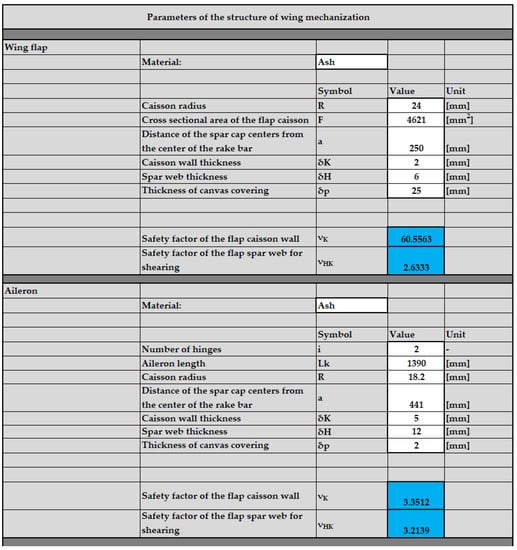 The most important step was to verify the calculated data defining the selected parameters of a given aircraft assembly using an Excel spreadsheet. Defining the following parameters using the functions contained in the sheet was associated with safety factors for a given structure, taking into account further elements such as: