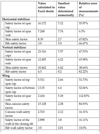 Almost all elements of the glider components met the assumption of a minimum value of the safety factor. Based on a compilation of the results determined with the spreadsheets and the values obtained using the strength analysis, some deviations were noted between them. However, it should be noted that the basic values assumed for the safety factor were close to 2.5. Taking into account a certain tolerance related to the measurement error resulting from the strength analysis carried out, it can be assumed that these results meet the expectations to a sufficient extent. The remaining results met the assumptions regarding the level of the safety factor. Thus, these results confirmed the sufficient correctness of the interface and knowledge base to determine the above-mentioned parameters of aircraft structures.