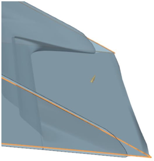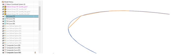 It was considered necessary to enter the profile shape in an exact, not approximated, form. For this purpose, a NACA profile generator was used, directly applying the equations describing the shape of the profile. A comparison of shape reproduction accuracy is shown in Figure 18. Approximated shape is highlighted in orange, exact shape in blue.