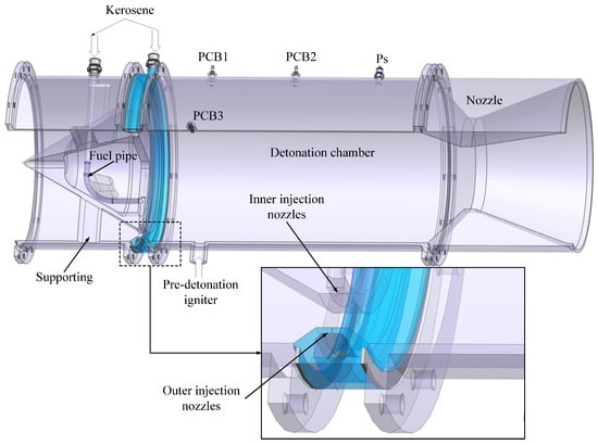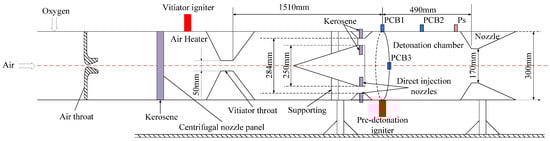 The air and oxygen mix and flow into the vitiator through a small throat, and there are 30 centrifugal nozzles installed on the spray panel to maintain the kerosene atomizing well. The high-enthalpy air retains the same mass fraction as pure air. The nozzles of the detonation chamber are direct injection nozzles at the entrance throat, the number of spray holes is 120 inside and outside of the throat, respectively, and the diameter of the spray holes is 0.3 mm. The inner and outer diameters of the entrance throat of the chamber are 250 mm and 284 mm, respectively; the length of the detonation chamber is 490 mm, and the radius of the nozzle throat is 170 mm. Therefore, the inlet throat area of the combustion chamber is 14,260 mm2, and the nozzle throat area is 22,698 mm2. In the experiment, the inlet mass flux of the chamber is adjusted by the different mass flow rates of the vitiator components, but the temperature remains unchanged.