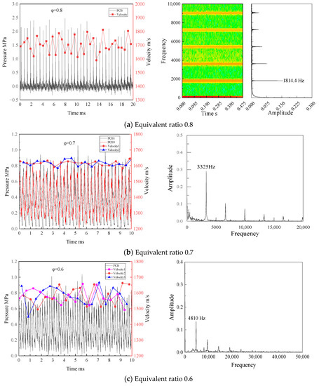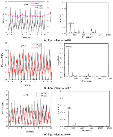 When the mass flux is reduced to 300 kg/(m2s), the rotating detonation wave in the detonation chamber tends to be a two-wave collision mode. When the equivalent ratio is 0.8, it can be seen that the time interval of the pressure peak appears alternately in the time sequence of PCB1, which is a typical two-wave collision propagation mode of the rotating detonation waves. When the equivalent ratios are 0.7 and 0.6, it can be seen from Figure 9b,c. The number of pressure peaks collected by PCB3 is about twice that of PCB1, so the collision point of the rotating detonation waves is near the PCB1 sensor, and the peak pressure measured by PCB1 at the equivalent ratio 0.7 is higher than that of equivalent ratio 0.8. In Figure 9, when the equivalent ratio changes, the propagation frequency of the collision rotating detonation waves changes slightly, and the propagation speed is much lower than the C-J theoretical value due to the process of developing from transmit shock to the rotating detonation wave each period after collision.