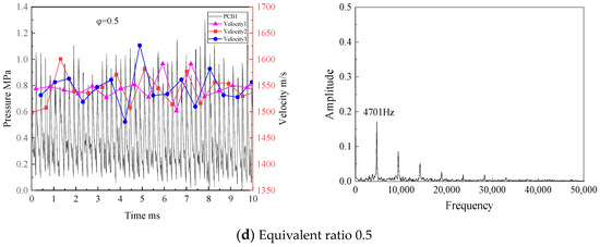 Figure 3 shows the pressure sequence and the Fast Fourier Transformation (FFT) results when the inlet mass flux is 400 kg/(m2s). As shown in Figure 3a, when the equivalence ratio is 0.8, the rotating detonation wave propagates in a fully developed single-wave mode. The average value of the detonation wave pressure peak is approximately 2 MPa, with a rotating detonation wave frequency of around 1814.4 Hz. The detonation wave propagation velocity can be calculated as 1710 m/s. As the equivalence ratio decreases, the detonation wave peak pressure decreases while the number of rotating detonation wavefronts increases. As shown in Figure 3b, the pressure sequences collected by PCB1 and PCB3 are similar, and the frequency of the rotating detonation wave is 3325 Hz, so it presents a two-wave, one-direction propagation mode for the rotating detonation wave when the equivalence ratio is 0.7. A three-wave, one-direction propagation mode of the rotating detonation wave appears when the equivalence ratios are 0.6 and 0.5, as depicted in Figure 3c,d, with the frequencies of the rotating detonation wave being 4810 Hz and 4701 Hz, respectively. The propagation velocity of the detonation wave is also provided in the pressure sequence figures. The detonation wave velocity is calculated by dividing the circumference of the outer cylinder of the combustion chamber by the time interval between two adjacent detonation wave peaks collected by PCB1. When the equivalent ratio decreases, the theoretical propagation velocity of the detonation wave decreases, and the decrease in the equivalent ratio is associated with a decrease in nozzle stiffness. This reduction in stiffness is influenced by factors such as decreased fuel injection pressure and diminished nozzle recovery time after the detonation wave passes. Consequently, the filling height of the subsequent cycle becomes insufficient, resulting in a decrease in detonation wave quality, peak pressure, and velocity. In the non-premixed chamber, a dual-wave system can emerge. This occurs when unburned reactants survive the leading detonation wave in the injector near field and are subsequently consumed within a trailing azimuthal reflected-shock combustion zone [39]. Furthermore, the trailing oblique shock wave reflects off the outer wall of the detonation chamber further downstream from the detonation wave. Since the detonation chamber lacks an inner tube structure, the unburned mixture begins to burn and gradually forms a new detonation front. Eventually, the system reaches a natural steady state of operation that balances mixture quality and wavefront quantity. Since the rotating detonation combustion cannot be initiated when the mixture equivalence ratio is lower than 0.5 in the tests, the equivalence ratio range is set between 0.5 and 0.8.