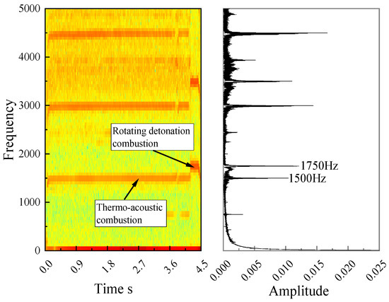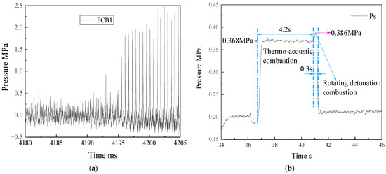 The rotating detonation wave becomes unstable when the inlet mass flux is 375 kg/(m2s), and the equivalent ratio is 0.8. The dynamic pressure sequence, along with the results of FFT and STFT, are displayed in Figure 4. In the dynamic pressure sequence diagram, the ignition time of the pre-detonation tube is at time zero. It can be observed that the basic frequency of the pressure wave is 1500 Hz during the first 4.2 s and 1750 Hz during the last 0.3 s. The frequency of 1500 Hz corresponds to thermo-acoustic combustion, while the frequency of 1750 Hz corresponds to rotating detonation wave combustion. A partially enlarged detail of tangential thermo-acoustic combustion is shown in Figure 5a. The total temperature of the incoming flow is 1250 K, and the mixture equivalence ratio is 0.8. Consequently, the total temperature of the burned gas can be estimated to be around 2610 K using the program developed by the research group. Since the Mach number of the gas flow is less than 0.3 in the chamber, the static temperature is close to the total temperature. Thus, the sound velocity of the burned gas can be estimated to be 959 m/s using the total temperature. With an outer diameter of 300 mm for the chamber, the tangential oscillation frequency in the combustion chamber is calculated to be 1425 Hz, based on the method introduced in the literature [43]. This presents a deviation of 5% when compared with the measured 1500 Hz in the test. Considering that there are errors in the test and calculation processes, the combustion mode during the first 4.2 s can be confirmed as tangential thermo-acoustic coupling combustion. The pressure sequence and propagation velocity of rotating detonation combustion are shown in Figure 5b. The average value of the detonation wave pressure peak is approximately 2 MPa, and the average velocity of detonation wave propagation is about 1610 m/s based on the frequency of 1750 Hz. Because the total temperature of the incoming air is as high as 1250 K, the kerosene quickly turns into steam in the high-temperature airflow. So, it assumes that the mixture in front of the detonation is gaseous, and the air and gaseous kerosene are mixed well. The C-J values of the pressure and the propagation velocity of the rotating detonation wave are computed by the NASA CEA [44]. The C-J theoretical velocity and pressure of the detonation wave are estimated to be 1694 m/s and 2.1 MPa, respectively. The measured velocity of rotating detonation wave propagation is slightly lower than the C-J theoretical value, as is the peak pressure. Since the deviation range is within 5%, it is confirmed that the rotating detonation wave is in the C-J detonation state during the last 0.3 s. Figure 6 displays the dynamic pressure and static pressure sequences of the combustion chamber when the combustion mode transitions from thermo-acoustic combustion to rotating detonation combustion. It can be observed that the static pressure in the combustion chamber increases from 0.368 MPa to 0.386 MPa. This results in a static pressure increase of about 5% for the rotating detonation combustion mode in the chamber. The pressure in the vitiator is higher than 2 MPa; meanwhile, the average pressure in the rotating detonation chamber is lower than 0.4 MPa, so the mass flow rate of the chamber is constant. According to the one-dimensional flow equation of , the total pressure increases by 5%, so the total temperature should increase by about 10%. It can be concluded that the efficiency of rotating detonation combustion in the chamber is higher than that of thermo-acoustic combustion. The specific impulse of RDE is improved by more than 10%, demonstrating the superior performance of detonation combustion.