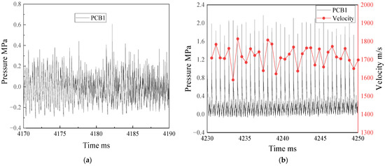 A pre-detonation tube igniter is used for ignition within the combustion chamber. If the mixture and combustion chamber structure conditions are suitable, rotating detonation combustion can be initiated. Factors such as the high total temperature of incoming air and high airflow speed at the fuel injection position contribute to improved atomization and evaporation of kerosene. As the fuel/air mixture flows to the engine’s ignition position, it transitions to a gaseous phase, which is one of the key factors for initiating and sustaining a pure air/kerosene rotating detonation wave. The dynamic pressure data in the combustion chamber are collected via an acquisition system with 16 parallel channels, and an acquisition frequency of 2.5 MHz. The pressure peak of the rotating detonation wave is measured by PCB113B26 quartz dynamic pressure sensor. There are three dynamic pressure sensors installed on the wall of the detonation chamber, as shown in Figure 1. The sensors PCB1 and PCB3 are distributed at a 90-degree angle in the same section of the chamber wall. The sensor PCB2 is set downstream of PCB1. The static pressure data in the combustion chamber is collected by an acquisition system of frequency 100 Hz.
