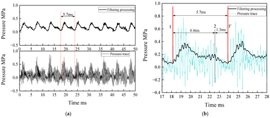 Dynamic pressure and the filtered results in combustion chamber at an equivalent ratio of 0.8 as the inlet mass flux is 350 kg/(m2s): (a) dynamic pressure and the filtered results; (b) enlarged partial view.