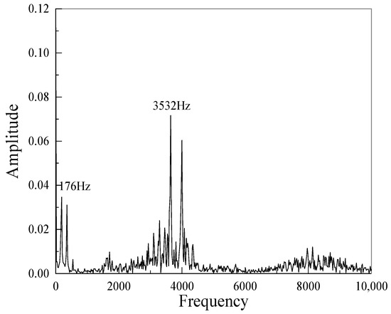 The dynamic pressure FFT results in Figure 8 show two main frequencies: one of 176 Hz corresponding to the axial pressure pulsation, and the other of 3532 Hz corresponding to the two-wave rotating detonation in one-direction propagation mode. As shown in Figure 7b, the peak pressure of the rotating detonation waves changes with the axial pulsation pressure, i.e., the maximum value for detonation wave pressure is about 1 MPa, and the minimum value is about 0.2 MPa, which is due to the different initial pressure of the mixture in front of rotating detonation wave.