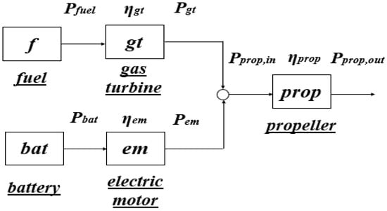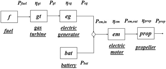 The symbols in the figure are defined as follows: f stands for the fuel, gt is the gas turbine, bat is the battery, em is the electric motor, prop is the aircraft propeller, P denotes power and η is the efficiency. These configurations can be generalized to the schematic shown in Figure 3. The general definitions of the efficiencies for series and parallel hybrid-electric configurations are explained in Table 1.