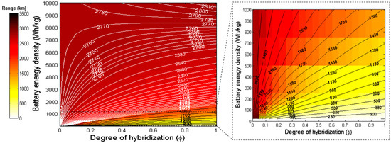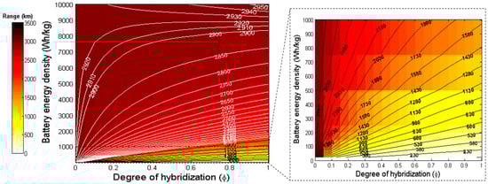 To demonstrate the dramatic impact that the correction of the definition of φ has, this paper will make use of the same case study worked out in [11]. We purposefully consider the same case study to show the effect that the new efficiency-based degree of hybridization has on the range. The input parameters are shown in Table 2. The results for a parallel hybrid and series hybrid configuration are shown in Figure 4 and Figure 5, respectively.