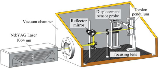 In the microimpulse measurement system, the torsion angle of the torsion pendulum beam, θ, was measured by displacement sensors. Figure 3 shows the impulse measurement torsion pendulum, mainly composed of precision flexible pivot, measuring beam, and high-precision displacement sensor. According to the theory of angular momentum [26,27,28], the microthrust caused the flexible pivot to rotate slightly. The maximum linear displacement after impulse loading could be measured through the displacement sensor, and its basic motion law can be explained through the following formula: T0 represents the acting time of the external force, J is the inertia moment of the torsion pendulum, c is the damping coefficient, k is the stiffness coefficient of the pivot, the external force is represented by f(t), and d is the arm of force acting through the external force. Formula (1) and the linear dependence of displacement are only valid when the torsion pendulum has a small amplitude.