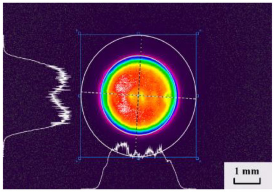 The ablation process of metal was achieved through a nanosecond pulse laser system with laser wavelengths and pulse widths of 1064 nm and 10 ns. During the experiment, the single-pulse laser energy was set to 500 mJ, and Figure 2 displays the mass distribution of the attenuated laser beam. The laser beam had the characteristic of a narrow energy rising edge, and although there were slight fluctuations, the peak energy of the laser was symmetrically distributed relative to the axis within the flat top range. The diameter of the spot on the target surface of the torsion beam was determined to be 3 mm by adjusting the relative position of the focusing lens in the optical path system. The multipulse laser’s operating frequency was set to 5 Hz. There was a cooling interval of 60 s after continuous operation for 100 s to avoid heat deposition that could affect the torsion pendulum’s inherent parameters and lead to measurement inaccuracies. In the experiment, a total of nine operating conditions, including 2000 to 18,000 pulses with 2000 intervals, were studied. To lessen uncertainty and error, five sets of experiments were repeated under a single operating state. The background pressure in the vacuum chamber was 10 Pa.