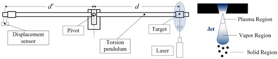 where ωn is the natural resonance frequency of the torsion pendulum, s is the maximum linear displacement measured by the sensor, and d′ is the distance between the measurement point and the pivot. In this system, the measurement arm d′ was 115 mm, and the ablation force arm d was 105 mm as shown in Figure 3.