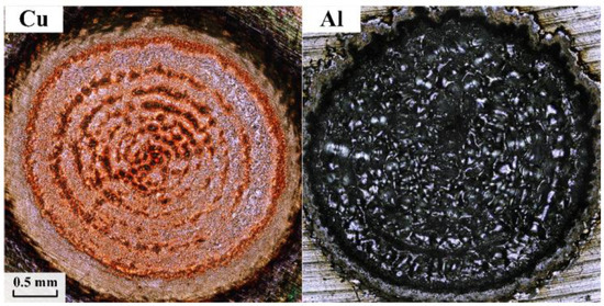 A shallow gasification mechanism is primarily responsible for the mass transfer of the metals exposed to nanosecond-pulse-width laser radiation. The rate of laser absorption directly affects how metals go through phase transition processes like melting and gasification. The Hagen–Rubens formula [30] is shown in (7), which can be used to calculate the absorption rate of metals for lasers with 1064 nm. The electrical resistivity under 20 °C is listed in Table 1. Al has a higher metal resistivity and a faster rate of energy absorption from the laser pulse than Cu. Al also has a lower melting point than Cu. As a result, the temperature of Al increases in response to repeated pulses, but there is no effective heat dissipation medium in a vacuum environment, resulting in the presence of molten metal in the high-temperature regions of the ablation pit. It is challenging to convert all of the molten aluminum into gaseous or plasma states due to the laser energy density of the huge light spot, which is 7 J/cm2. As the number of pulses increases, the proportion of molten aluminum that splashed out into the plume increases, and it rapidly cools to form a remelting protrusion phenomenon when the pulse laser stops working.