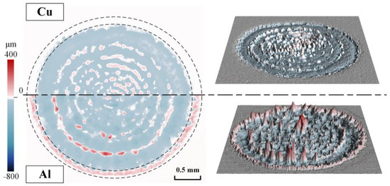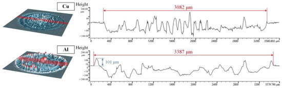 To further analyze the internal morphology, Figure 6 displays the axial contour statistics for the ablation pit with a pulse count of 2000. The diameter of the ablation pit of the copper target is 3082 μm. The diameter of the aluminum surface with morphology changes is 3387 μm nevertheless. The annular protrusion formed at the outer edge of the ablation area is 101 μm tall. In addition, with 2000 pulses, it was found that the morphology of the copper surface has denser protrusions near the center but a lower height than the aluminum surface.