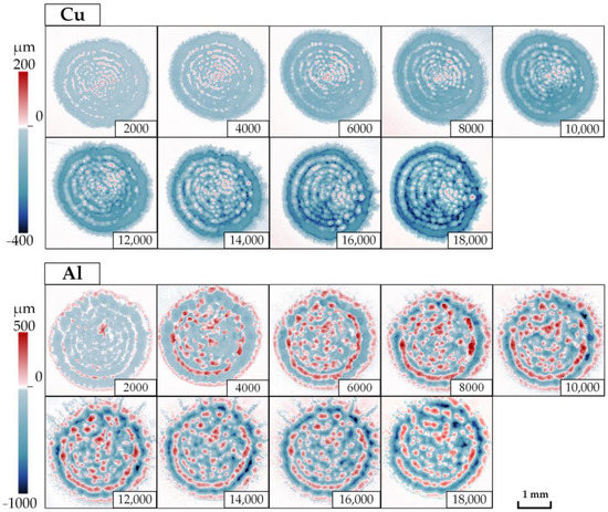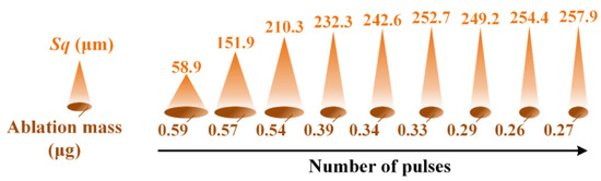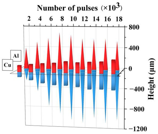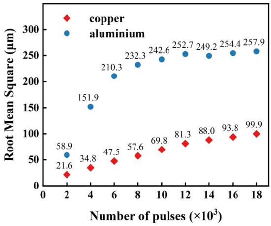 Figure 9 shows the trend of the surface roughness parameter Sq as the number of laser pulses increases. For Cu, the root mean square height of the ablation morphology increases linearly with the pulse counts, but the overall value is modest. When the number of pulses reaches 18,000, the Sq of the ablation pit is 99.9 μm. The ablation surface of Al is more complex and has a higher roughness. The effect of the increasing pulses on the surface roughness can be disregarded once the number of laser pulses reaches 8000 or more because the rate of increase of the root mean square height rapidly declines.