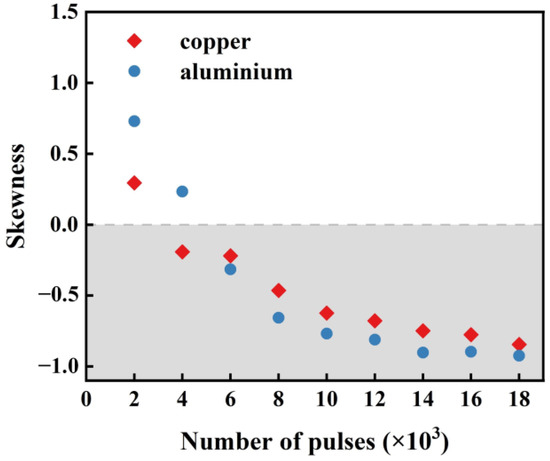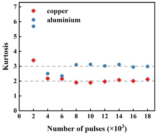 The roughness parameters of the ablation pits, skewness and kurtosis, are, respectively, listed in Figure 10 and Figure 11. Figure 10 shows that the development laws of the two metals are similar. The height distribution of the ablation pits is lower than the average under the condition of few pulses. The morphology becomes more dominated by the remelting protrusion phenomena as the pulse count rises, resulting in a gradually rising height distribution. In Figure 11, both Cu and Al exhibit strong sharpness on the ablated surface after 2000 pulses, which rapidly decreases after 4000 pulses. The Sku of the surface of Cu is basically steady and is less affected by the number of pulses. After 8000 pulses, the Sku of the ablation surface of Al is stable at three, indicating that the height of the ablation morphology follows the normal distribution currently, while the height distribution of the copper surface is relatively flat.