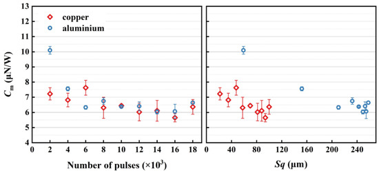 The roughness of the ablation morphology is connected to the propulsion performance under various working conditions. In Figure 12, an impulse coupling coefficient scatter distribution map is created using the root mean square height for various pulse counts as the independent variable. As the surface roughness increases, the Cm of the metal targets gradually decreases. Less laser energy contributes to propulsion when the roughness of Al reaches 200 μm or higher or when there have been more than 6000 repeated pulses. However, owing to the low melting point and the first ionization energy, Al tends to be peeled off to generate an impulse. As a result, the two metals’ difference in roughness becomes more noticeable as the pulses grow, yet the targets’ Cm values are similar and basically stable at 6 μN·W−1.