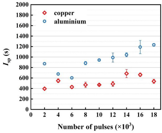 - The Cm of the two metals continuously decreases as the roughness of the morphology increases. Under various pulse numbers, the Sq of the copper surface is below 100 μm, and the Isp distribution is between 300 and 700 s, with a small amplitude for the propulsion parameter. Due to changes in the single ablation mass, as the number of pulses increases, the impulse generated by Al gradually stabilizes, but the Isp shows a gradually increasing trend.