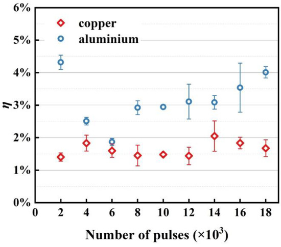 The correlation between the ablation efficiency and pulse number is depicted in Figure 15. A lower level of metal ablation efficiency is produced in this situation due to the laser’s low energy density. According to the analysis of the ablation morphology and specific impulse distribution, the ablation efficiencies of Cu with different laser pulses are less than 2%, which is generally lower than the results of Al. The Isp of Al increases with the number of pulses, which improves the ablation efficiency of the working medium. As a result, the plume gains more kinetic energy with the same laser energy density, reaching the high value of 4.01% at 18,000 pulses. The figure also shows that the large impulse generated by Al under the action of 2000 pulses improves the ablation efficiency.