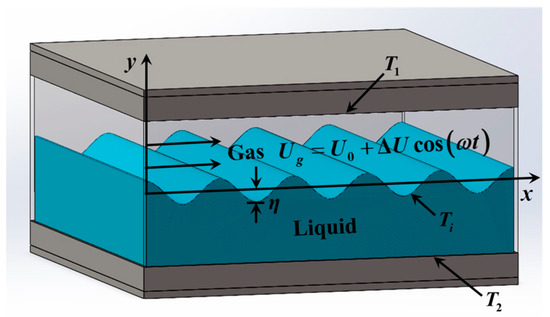 The present study focuses on the K-H instability of viscous liquid film with a co-flowing gas stream under acoustic oscillations. The acoustic oscillations are expressed as the oscillations of gas velocity. In addition, considering that the phase change caused by the temperature difference may affect the growth of the disturbance amplitude [29,30,31], the heat and mass transfer are also taken into account based on the simplified model of Hsieh [32,33]. The ratio of the conduction heat flux to the evaporation heat flux is used to characterize the heat and mass transfer. Considering that the heat convection is much stronger than the heat conduction in practical cases, a correction factor is introduced to satisfy the heat flux ratio within a reasonable range. The viscous potential flow theory is used to obtain a dispersion relation, which has been used to investigate the KHI in previous studies [34,35,36,37,38,39,40]. The dispersion relation between the temporal growth rate and the disturbance wave number is obtained. Furthermore, the effects of the acoustic oscillations, Weber number, heat and mass transfer, as well as other key parameters on the interfacial instability are discussed.