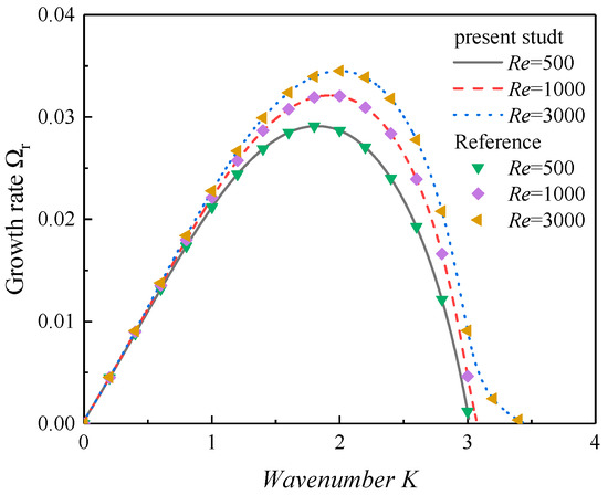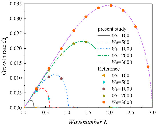 As the phase change and acoustic oscillations are ignored, the liquid layer is sheared by the high-speed gas stream, and this simplified model is similar to that of Funada et al. [53]. Figure 2 shows the results obtained by Equation (41) and the dispersion relation of the present study without the phase change and acoustic oscillations (i.e., and ). The curves shown in Figure 2 are normal. Before a maximum value was reached, the curves increased firstly with the wavenumber. After the maximum value, the curves decreased due to the impact of the viscosity of the liquid and the surface tension, and an abscissa-crossing point was reached. The dominant wavenumber is the wavenumber corresponding to the maximum growth rate. In addition, the range of the wavenumber from 0 to the abscissa-crossing point is known the unstable range. It can also be observed that the interfacial instability was promoted as the surface tension decreased. Figure 3 displays the results of this work compared with that of Asthana and Agrawal [34] when the heat and mass transfer were considered. In addition, the results of the simplified model in this work were in good agreement with previous studies, and the correctness of the dispersion relation obtained in this work was verified to a certain degree.