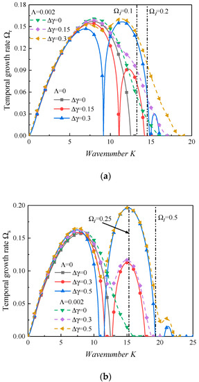 Figure 9 shows the influence of the viscosity of the gas medium on the interfacial instability of the liquid film. It is clear that the growth rate of the inherent and parametric regions increased as the gas–liquid viscosity increased. The results predicted that increasing the viscosity of the gas would promote the KHI and PI. This conclusion is consistent with that reported by Funada et al. [57], who examined the linear stability of a viscous liquid jet exposed to a viscous gas phase. However, its destabilizing effect is neglectable because the gas–liquid viscosity ratio .