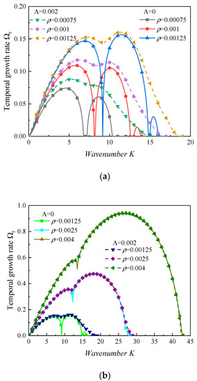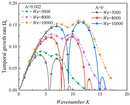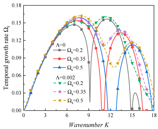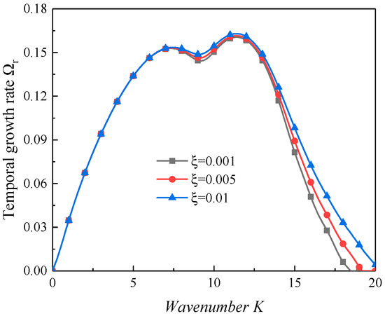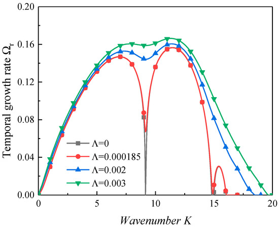Figure 10 shows the variation in the growth rate by varying from 0 to 0.003 as the acoustic oscillations are taken into account. In this work, represents the ratio between the conduction heat flux and the evaporation heat flux, and it is employed to characterize the heat and mass transfer. As displayed in Figure 10, the interfacial instability was promoted as the heat and mass transfer were enhanced. It can be concluded that the heat and mass transfer had a destabilizing effect. Furthermore, the unstable regions expanded obviously as the phase transition appeared. Zeng et al. [58] investigated the primary breakup process numerically with the evaporation effect. The results suggested that the phase change could promote the KHI. Chan et al. [59] examined the mass transfer on the KHI at the gas–liquid interface. The authors concluded that the evaporation enhanced the wave instability. Although the physical model of the present study was somewhat different from those of Zeng et al. [58] and Chan et al. [59], the qualitative tendency was consistent.