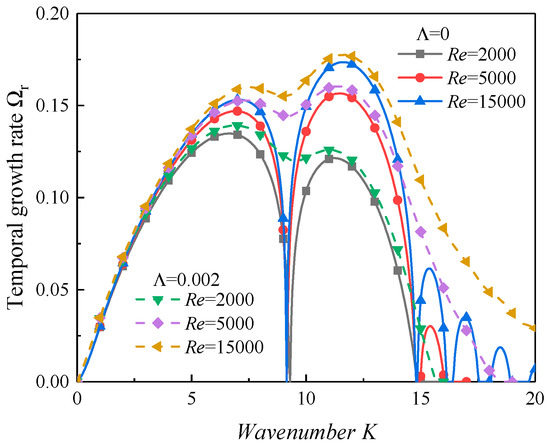 Then, the effect of the viscosity of the liquid film on the surface instability was examined. It is obvious in Figure 8 that the both the inherent and PI regions increased when the Reynolds number increased. This predicted that the viscosity of the liquid would play a stabilizing role. Jia et al. [23] examined a two-dimensional liquid jet exposed to gas, as the longitudinal acoustic oscillations were considered, and the authors reported that the liquid viscous dissipation was proportional to . According to Equation (40) in this work, the damping effect of the viscosity of the liquid film was proportional approximately to , similar to the study of Kumar [56]. Moreover, it can also be concluded that there is a critical Reynolds number , the location of the maximum growth rate is in the KHI region as , and it shifts to the second unstable region when , as shown in Figure 8. A larger wavenumber corresponds to a shorter wavelength because of . According to recent studies [11,12,14,15,16], the atomization quality may be improved in the breakup process when the Reynolds number increases.