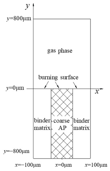 The sandwich model of the propellant is displayed in Figure 1. In the figure, y = 0 μm denotes the burning surface, which defines the interface between the gas and solid phases. The solid-phase region below the surface contains AP and a binder matrix that is a homogeneous mixture of HTPB and fine AP. The widths of the coarse AP and binder matrix are calculated based on their respective contents. The propellant has a width of 100 μm and a height of 800 μm. Above the burning surface is the gas-phase region, which has the same computational domain as the solid-phase region.