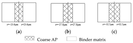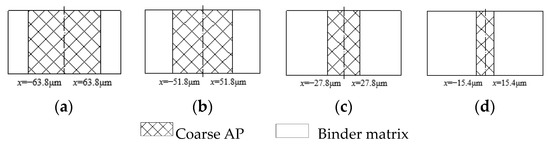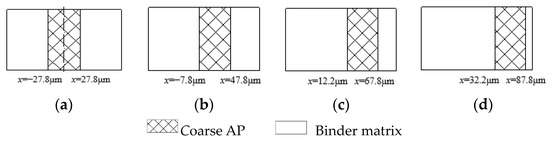 Four propellants are selected in this section to study the effect of fine AP content with varying mass fractions, as shown in Table 3. The propellants P-1 to P-4 are prepared with different levels of fine AP, ranging from 0% to 70%. When the mass fraction of fine AP increased while the content of HTPB remained constant, some coarse AP was replaced by fine AP. This results in a decrease in the width of coarse AP and an increase in the width of the binder matrix, as illustrated in Figure 6.
