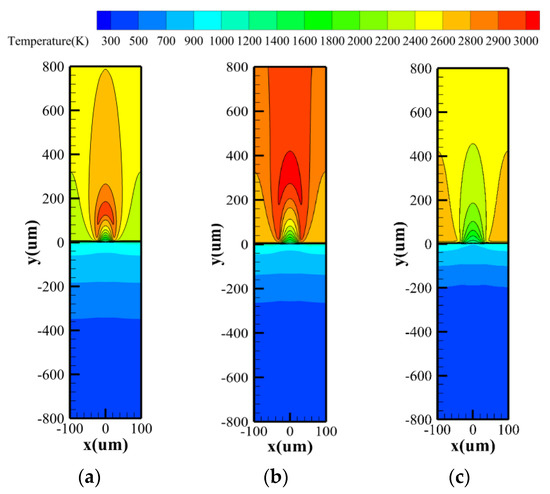 Figure 4 shows the temperature field for three of the propellants at 6.89 MPa, with maximum temperatures of 2930 K, 3040 K, and 2700 K and average temperatures corresponding to 2529 K, 2859 K, and 2471 K for each. Furthermore, the adiabatic combustion temperature of the combustion at pressures of 6.89 MPa was calculated by chemical equilibrium application (CEA) code and compared with the present predictions. The maximum error is 7%. The variation of the burning rate and surface temperature of the propellant with total AP content is shown in Figure 5. The burning rate initially increases and then decreases with the total AP content. The highest burn rate of 2.3 cm/s is achieved at an AP content of 87.5%, with a similar trend for the surface temperature. It indicates that the overall oxygen-to-fuel ratio of the propellant has a significant effect on the gas-phase flame temperature and burn rate. In addition, there exists an optimal oxygen-to-fuel ratio that maximizes the burning rate, as found in reference [41]. Therefore, a propellant containing 87.5% AP is selected for the follow-up study.