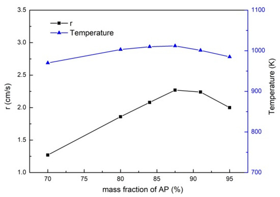 - The temperature of the gas phase and burning rate initially increases and then decreases with the overall AP content; there is an optimal oxygen-to-fuel ratio that maximizes the burning rate, which is nearly 87.5%;