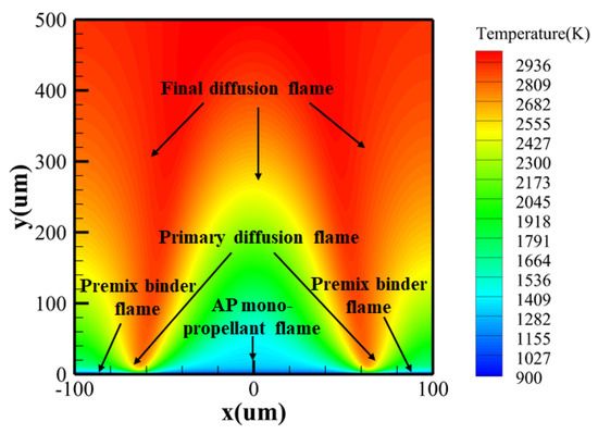 The temperature field is used to describe the overall flame structure. The results in Figure 7 indicate that, at a pressure of 6.89 MPa, the flame structure of P-2 exhibited a multi-flame structure, which is consistent with the findings observed in the experimental results [15] as well as the improved BDP model [24]. This suggests that the numerical simulation method adopted in this study is reliable and can effectively predict the flame structure of the propellant system. The AP decomposition flame mainly dominates the combustion of coarse AP particles on its surface. The primary diffusion flame is located near the burning surface at the AP/HTPB interface, while the final one is situated above it. Moreover, the premixed binder flame is formed above the binder matrix as a result of the reaction between decomposed AP and HTPB that are homogeneously mixed.