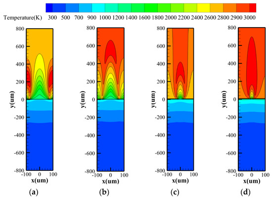 Figure 8 shows the results of combustion simulation at 6.89 MPa for the four propellants listed in Table 3, all of which reached temperatures of 3000 K. Although the temperature distribution of the four propellants in the gas phase is quite different, the solid phase is basically the same, which is due to only heat conduction in the solid phase. The flame shape above the binder matrix is closely related to the fine AP content. When there is an increase in fine AP content, the premixed flame above the binder matrix gradually dominates over the diffusion flame (see Figure 8a–d), resulting in significant improvements in the thermal feedback of the flame to the burning surface. Furthermore, the diffusion flame also changes. The highest temperature region above the binder matrix in our experiment reached 3000 K, and this region is relatively small, as shown in Figure 8a. With an increase in the fine AP content, the high-temperature region shifted to the top of the coarse AP (as seen in Figure 8b). As Figure 8c shows, when the mass fraction of fine AP reaches 55.9%, the leading edge of the diffusion flame approaches the burning surface. When the amount of fine AP is further increased (as seen in Figure 8d), the high-temperature region becomes larger and closer to the surface. The average temperatures in the gas-phase regions for all four propellants tested in our research were 2562 K, 2749 K, 2859 K, and 2950 K, respectively. Heat feedback from the diffusion flame to the burning surface is determined by the heat release of the flame and the distance between the leading edge and the burning surface. As the mass fraction of fine AP increases, Figure 8d demonstrates that the heat feedback of the diffusion flame to the burning surface increases while the distance decreases, resulting in a significant increase in the burning rate. The heat feedback from the diffusion flame to the burning surface is affected by both the heat release of the flame and the distance between the leading edge and the burning surface. Figure 8 shows that an increase in the mass fraction of fine AP leads to greater heat release to the burning surface and a decrease in the distance between them. This greatly increases the heat feedback to the surface, which significantly increases the burning rate.