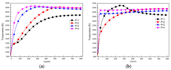 Figure 9 displays the temperature profile along the y-axis at x = 0 μm (coarse AP central location) and x = ±100 μm (binder matrix central location). As shown in Figure 9a, P-1 reaches a maximum temperature of 2600 K in the gas-phase region with the smallest temperature gradient, while P-4 reaches 3000 K with the largest gradient. This indicates that the heat feedback of the diffusion flame is enhanced with an increasing mass fraction of fine AP. Figure 9b illustrates the temperature gradient variation above the binder matrix. For P-1, the high-temperature region is above the binder matrix, and the temperature reaches 3000 K. As for P-2, the diffusion flame is still dominant above the binder matrix when the high-temperature region transfers to above the coarse AP, and both the temperature and gradient decrease. In contrast, when the premixed flame replaces the diffusion flame as the dominant factor, as shown in P-3 and P-4, the gradient increases significantly.
