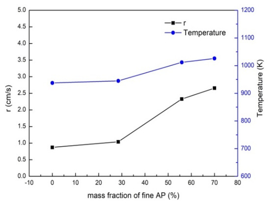 The average surface temperature and burning rate for the four propellants are presented in Figure 10. As the mass fraction of fine AP increases from 0% to 70.0%, the surface temperature increases from 937 K to 1026 K, and the burning rate rises from 0.9 cm/s to 2.7 cm/s.