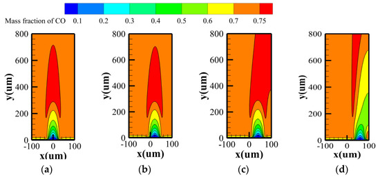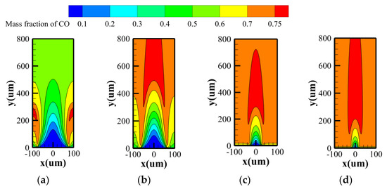 The mass fraction distribution of CO: (a) P-3; (b) P-3-1; (c) P-3-2; (d) P-3-3.