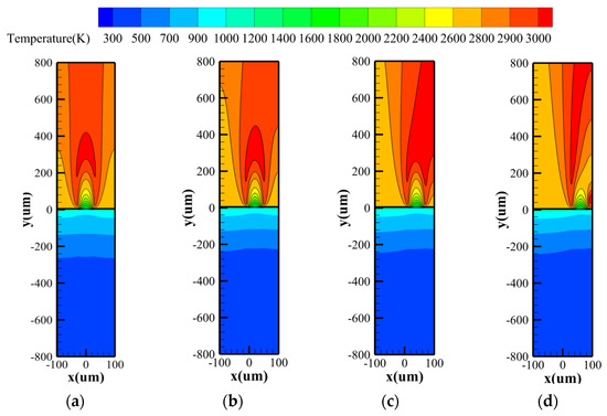 Temperature distribution for different coarse AP positions with the same propellant formulation: (a) P-3; (b) P-3-1; (c) P-3-2; (d) P-3-3.