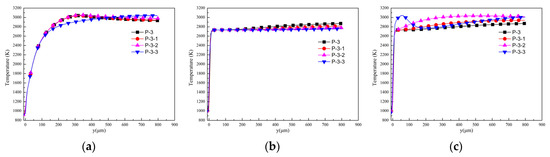 The distribution of temperature along the y-axis at different positions: (a) the center of coarse AP (b) x = −100 μm; (c) x = 100 μm.