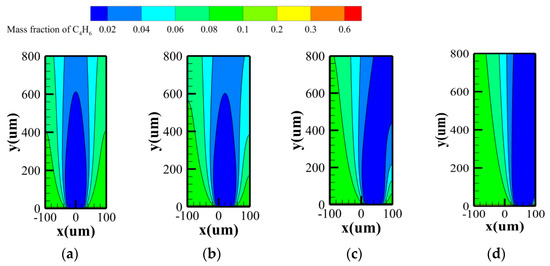 The mass fraction distribution of C4H6: (a) P-3; (b) P-3-1; (c) P-3-2; (d) P-3-3.