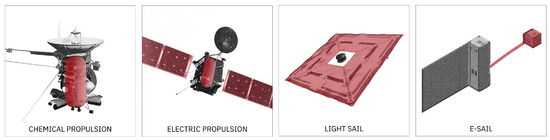 Propulsion systems differ in their overall volume and dimensions [3]. NASA Cassini’s (Launch Mass: 5.8 t) chemical propulsion tank takes up more than half of the spacecraft’s mass when full and serves as a structural element around which the probe is built. ESA Rosetta’s (LM: 3 t) electric propulsion tank takes up less than half of the spacecraft’s mass, but the propulsion system requires large solar panels. JAXA IKAROS’ (LM: 0.3 t) lightsail is 14 m × 14 m in size and requires no propulsion tanks. The E-sail can be deployed kilometres in length from a <10 kg cubesat. Artwork credit: Rute Marta Jansone.