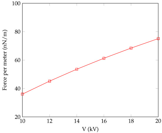 where is the switching parameter (which models the activation or deactivation of the electron emitter), km/s is the solar wind speed at a distance of one astronomical unit from the Sun [4], L is the total tether length, is the Sun–spacecraft unit vector, m is the spacecraft mass, V is on the order of 10–20 kV, is the electric potential corresponding to the kinetic energy of the solar wind ions (a value of 1 kV is considered according to [27]), is the vacuum permittivity, kg is the solar wind ion (proton) mass, m is the local solar wind number density [4]. The parameter that depends on the distance from the Sun is n, which scales at . However, since the distance from the Sun is approximately constant in the analysed mission scenario, the value of n is also assumed to be constant.