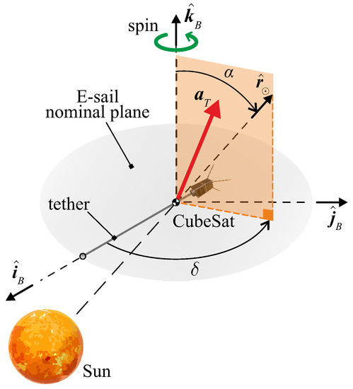 Consider a body reference frame , with its origin S located at the spacecraft centre of mass, and unit vectors . In particular, is aligned with the tether direction, is aligned with the spacecraft spin axis direction, and . From [26], we know that the E-sail propulsive acceleration , averaged over one spin period, can be expressed in a vectorial form as