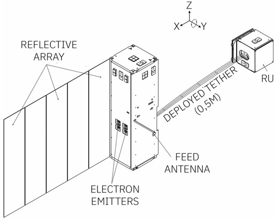 Our in-orbit demonstration missions thus far have a single tether and we are considering single-tether E-sail concepts in the scope of ESTCube lunar cubesat and Multi-Asteroid Touring (MAT) [29,31]. The ESTCube concept is the simplest case where the main spacecraft hosts the spin control propulsion system and there is a simple end mass keeping the tether stretched. The MAT concept, represented in Figure 5, hosts the propulsion and control system on board a remote unit that is attached to the end of the tether instead of the end mass. As the remote unit has to be a complete self-sufficient system, this solution is considerably more complex. However, having a remote unit at the end of the tether helps to minimise the spin control propellant consumption and may also improve single-tether controllability.