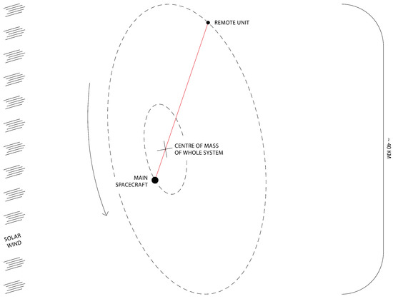 E-sail hardware consists of the following components: a tether on a motorised reel, a high-voltage source, an electron emitter, control electronics, mechanical locks, structure, enclosure and end-mass or remote unit (RU); see Figure 4 as an example of the Multi-Asteroid Touring (MAT) concept. E-sail’s early operations start with spinning up a spacecraft and deploying the tether centrifugally. The motor is used to control and measure the deployment rate. While the system’s angular momentum remains the same, the spin rate decreases as more tether is deployed. For in-orbit demonstration missions, the tether has an end mass that keeps it stretched. For more advanced E-sail missions, the end mass can be replaced by a remote unit. This results in an increase in mass and complexity, but in exchange it introduces new options, such as spin rate and plane control using an increasing arm length. Placing the spin control unit far from the spacecraft–remote unit centre of mass helps to minimise the propellant used to control the spin rate and plane orientation. When the whole tether is deployed, the E-sail can start its proper operations (more details in Section 2.3).
