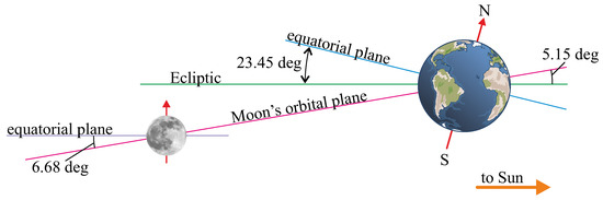 From Equation (3), it can be observed that the average propulsive acceleration vector lies on the plane defined by and , as illustrated in Figure 3. The angle between and is the classical sail cone angle rad, while the angle between and the projection of on the sail spin plane is the clock angle rad.