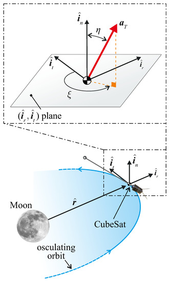 Bearing in mind Equation (3), it can be verified that the direction of the spin axis (i.e., the direction of the unit vector ) that maximises the projection of the thrust vector along a given direction coincides with the bisector of the unit vectors and . The directions of the propulsive acceleration that maximise and are, respectively, the velocity unit vector and , which is given by