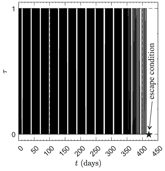 Accordingly, the locally optimal control law can be summarised as follows: if pericenter radius of the osculating orbit is below a given threshold value , is oriented to maximise the acceleration projection along and avoid collision; otherwise, unit vector is oriented to maximise the projection of the propulsive acceleration along in order to achieve escape conditions as rapidly as possible. This specific strategy is chosen after observing that maximising provides a faster escape strategy compared to maximising or linear combinations of and . However, such strategy also increased the risk of impact with the lunar surface. Finally, the switching parameter control law is selected as follows: the E-sail charge is turned off (i.e., ) when the spacecraft is in eclipse conditions, or the Moon passes through the Earth’s magnetosphere, or the projection of the propulsive acceleration along (or ) is negative.