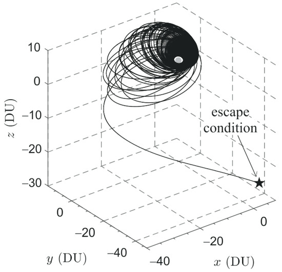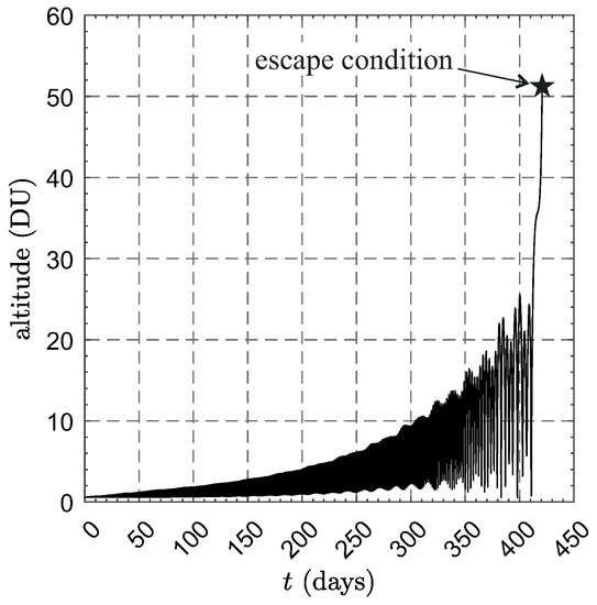 In the case of the parking orbit with an initial altitude of 1000 km and a tether of 4 km, the E-sail charge is turned on for approximately 26.6% of the total flight time. In this case, the time variation of the switching parameter is illustrated in Figure 11, which shows the low-frequency changes attributed to the influence of the Earth’s magnetosphere. On the other hand, the high-frequency variations are a consequence of the other control law constraints, and exhibit a period equal to that of the osculating orbit. As expected, this period increases during the maneuver. Examining the graph sketched in Figure 12, it is evident that the spacecraft’s average altitude gradually rises over time, as expected. The black star represents the point in which the spacecraft reaches the escape conditions. Finally, the three-dimensional escape trajectory is reported in Figure 13.